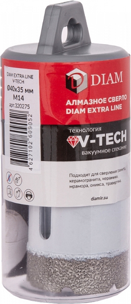 Алмазное сверло вакуумного спекания Diam Extra Line V-Tech M14 40 мм (Диам Экстра Лайн В-Теч М14 40 мм) предназначено для сверления отверстий Ø 40 мм, глубиной до 35 мм в керамике, граните, керамограните, мраморе, ониксе, травертине без водяного охлаждения при помощи ушм (болгарок), перфораторов, дрелей.
