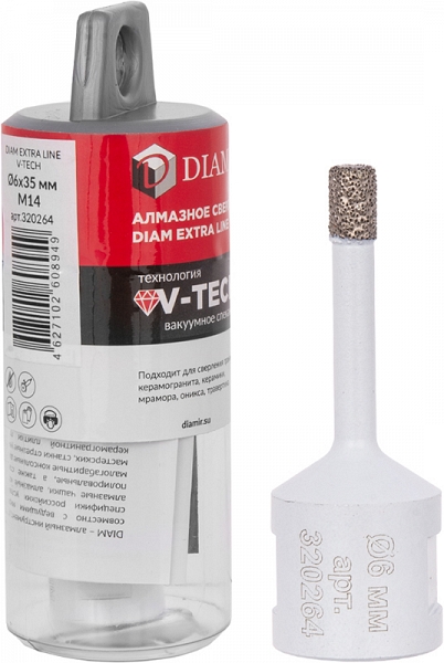 Алмазное сверло вакуумного спекания Diam Extra Line V-Tech M14 6 мм (Диам Экстра Лайн В-Теч М14 6 мм) предназначено для сверления отверстий Ø 6 мм, глубиной до 35 мм в керамике, граните, керамограните, мраморе, ониксе, травертине без водяного охлаждения при помощи ушм (болгарок), перфораторов, дрелей.