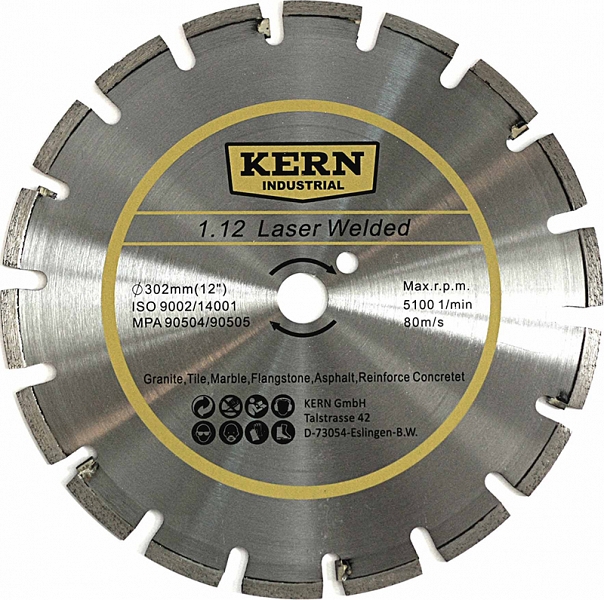 Алмазный диск Kern 1.12 Laser Welded With Protected Tooth 402 мм (Керн 1.12 Лазер Велдед Протектед Тутс 402 мм) – отрезной сегментный алмазный круг для мокрой алмазной резки железобетона, асфальта, гранита, каменных плит, плитки, мрамора и т.п. Используется с бензорезами, электрическими резчиками, камнерезными станками, настольными пилами, стенорезными машинами, швонарезчиками и другой алмазной техникой.