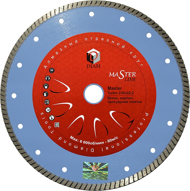 Алмазный отрезной круг Diam Master Line Turbo Master 230 мм (Диам Мастер Лайн Турбо Мастер 230 мм) – профессиональный алмазный диск для сухой резки бетона, слабоармированного бетона, огнеупоров, кирпича, тротуарной плитки, общестроительных материалов.