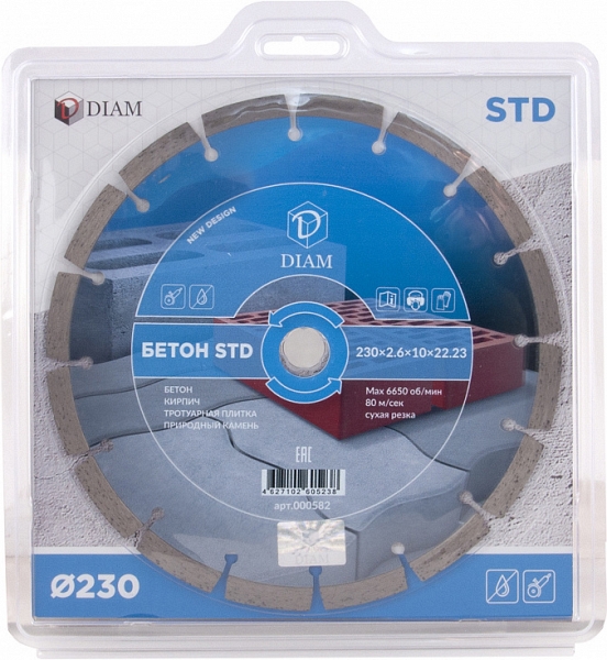 Алмазный отрезной круг Diam STD 1A1RSS Бетон 230 мм (Диам СТД 1А1РСС Бетон 230 мм) – сегментный алмазный диск для сухой резки бетона, кирпича, тротуарной плитки, природного камня, без водяного охлаждения.