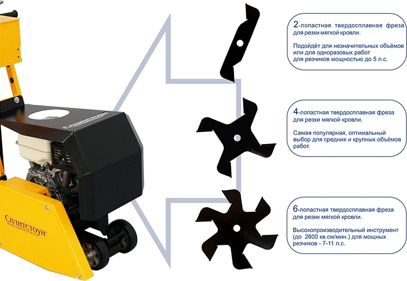 – Рекомендовано применение четырехлопастных и шестилопастных твердосплавных кровельных фрез: если Вы хотите в первый раз попробовать, то можете использовать более дешевую, но менее ресурсную и менее производительную фрезу кровельную твердосплавную двухлопастную Сплитстоун Премиум Кровля 90; рекомендуем, в первую очередь, фрезу кровельную твердосплавную четырехлопастную Сплитстоун Премиум Кровля 180, как более производительную; также рекомендуем использовать наиболее производительную и ресурсную фрезу кровельную твердосплавную шестилопастную Сплитстоун Премиум Кровля 270 - Конструкционной особенностью является обратное вращение режущего инструмента, что позволяет избежать выброса мусора в прорезанный шов и обеспечивает высокое качество работ: обратное вращение режущего инструмента способствует быстрому и эффективному выведению шлама из прорезаемых швов, при этом кровельная фреза вспарывает материал мягкой кровли