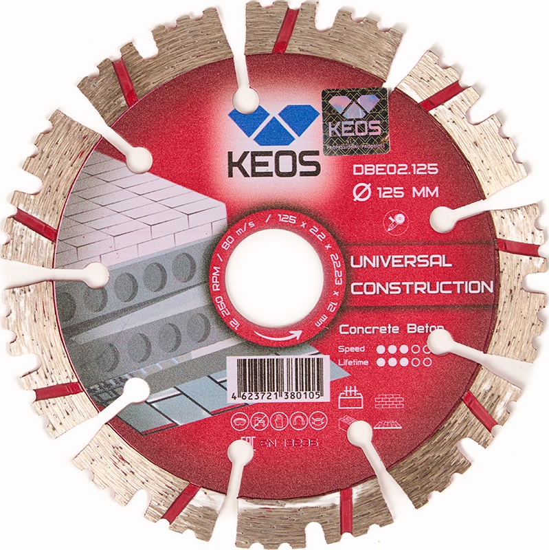 Диск алмазный сегментный Keos Universal Construction 125 мм (Кеос Констракшен 125 мм) предназначен для резки бетона, железобетона и кирпича на ушм (болгарках), штроборезах и системах резки крупноформатной плитки, как с подачей воды, так и всухую.