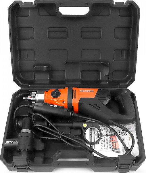Дрель алмазного бурения с микроударом Messer DDM-150 (Мессер ДДМ-150) предназначена для сухого сверления отверстий Ø 30 – 150 мм с микроударом в твердых материалах, таких, как: железобетон, кирпич, камень; без подачи воды. Используется для общестроительных работ, отделки, электромонтажа, монтажа сантехники, вентиляции, сплит-систем и многого другого.