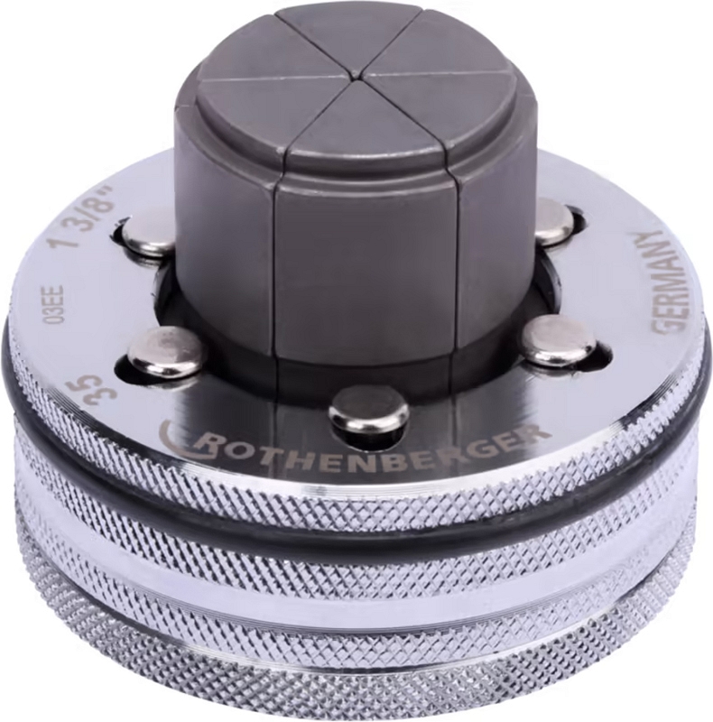 Экспандерная головка Rothenberger Rolock 35 мм (1 3/8")×1,6 мм (Ротенбергер Ролок 35 мм (1 3/8")×1,6 мм) – клепаная расширительная насадка для расширения мягких и полутвердых медных труб Ø 35 мм (1 3/8"), толщиной стенки до 1,6 мм, для изготовления точных муфтовых соединений в соответствии с нормами DVGW / DIN / ГОСТ и Gas de France.