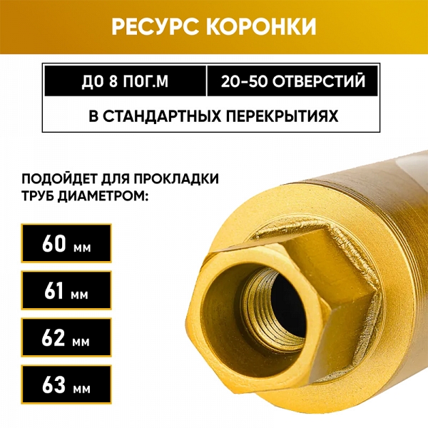 - Ресурс: 8 – 14 погонных метров, что составляет 20 – 50 отверстий в стандартных перекрытиях