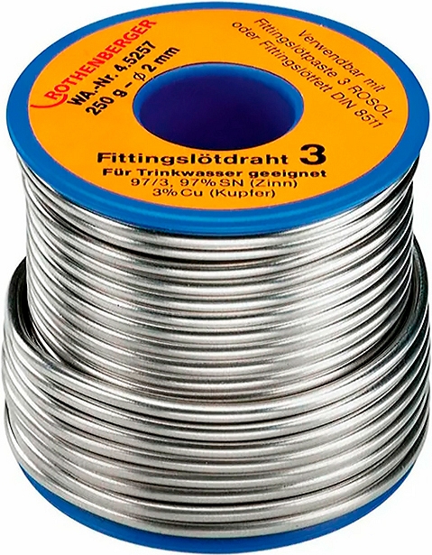 Мягкий припой для медных труб Rothenberger 3 (Ротенбергер 3) предназначен для пайки медных труб с фитингами из меди, красной бронзы, латуни с помощью паяльника электрического, пропановой горелки, горелки ацетиленовой, пропано кислородной горелки (для труб Ø от 28 мм) при монтаже систем трубопроводов горячего и холодного водоснабжения в соответствии с DVGW, предписание GW 2.