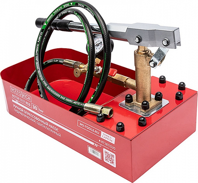 Опрессовщик ручной гидравлический Rotorica Rotor Test Eco (Роторика Ротор Тест Эко) – насос опрессовочный ручной одноклапанный для проверки герметичности и гидравлических испытаний давлением до 30 бар небольших систем отопления, водоснабжения, солнечных коллекторов, резервуаров и т.д. на герметичность, подходит для ежедневного профессионального использования.