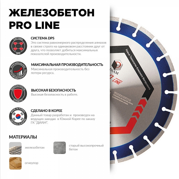 Сегментный алмазный круг Diam Pro Line 1A1RSS Железобетон 300 мм (Диам Про Лайн 1А1РСС Железобетон 300 мм) – профессиональный алмазный отрезной диск с лазерной сваркой сегментов, произведенный по технологии DPS – позиционирования алмазов в режущем слое, для сухой и мокрой резки железобетона, старого высокопрочного бетона, огнеупоров на бензорезах, электрических резчиках и плиткорезах, камнерезных станках, стенорезных машинах, швонарезчиках, как с охлаждением, так и без.