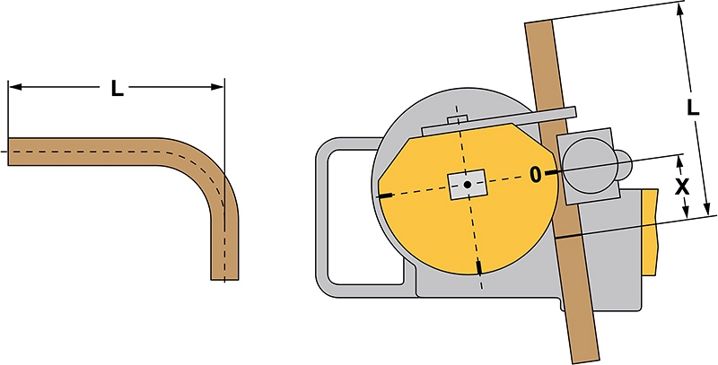 Если дуга должна располагаться на определенном месте трубы, следует соответственно размеру трубы произвести корректировку длины. Для изгиба колен 90° или 45° необходимо произвести корректировку согласно размеру X. Для этого сократить желаемую длину L на показатель X. Если при размере трубы 22 величина L = составляет 400 мм, и необходимо создать дугу с радиусом изгиба 77 мм, то размерную риску на трубе необходимо нанести на 319 мм. Эта разметка должна быть зафиксирована на маркировке 0 сегмента гибки. - Смазочные материалы для гибки: